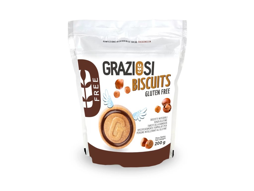 Zloženie: Múka z hnedej ryže 28%, Bezlepková celozrnná ovsená múka 16%, Rastlinné oleje a tuky (slnečnicový olej, Bambucké maslo, Voda, Emulgátory: E471, E475, Regulátor kyslosti: E330, Arómy), VAJCIA, kokosový cukor 14%, kukuričná múka. Náplň: Gianduia Cream 15% [cukor, rastlinný olej (slnečnicový, palmový), nízkotučné kakao, kakaové maslo, LIESKOVÉ ORIEŠKY 1%, sušené plnotučné MLIEKO, emulgátor: SÓJOVÝ lecitín], arómy. Môže obsahovať stopy iných ORECHOV, SEZAM. Skladujte na suchom, chladnom mieste a chráňte pred slnečným žiarením.
